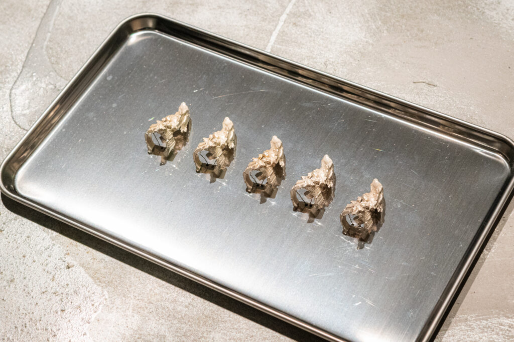 Hirtentreu and Popolitova’s installation functions as an aesthetic laboratory with an indeterminate temporal origin — half sanctuary, half clinic — where fictional medical and cosmetic objects intertwine, such as a nail-sucker, butt-shaker, gaze-amplifier, and body-starter, as well as animal-derived objects and materials like silver, charcoal, and stone. Together, they appear to be attempts at inventing yet another absurd beauty procedure that would ensure eternal youth for the body. Through the materials used, the artists highlight the invasive methods and nearly impossible standards employed to achieve beauty and youth.