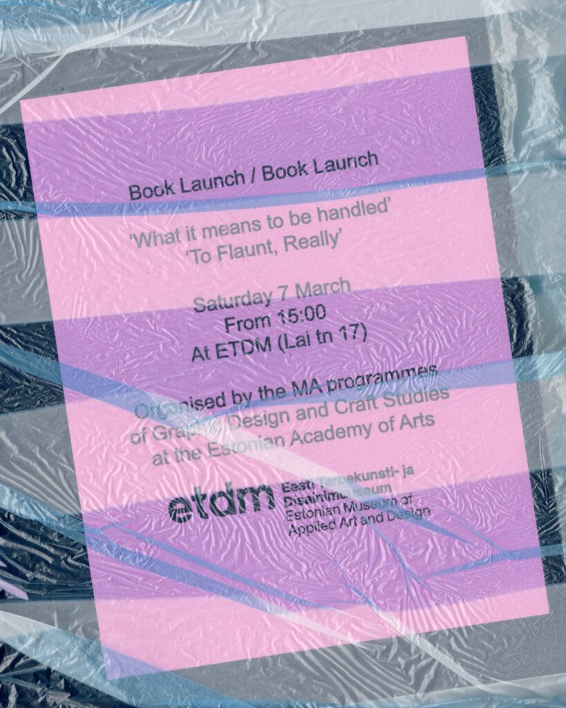 Laupäeval, 7. märtsil toimub Eesti Kunstiakadeemia / Estonian Academy of Arts graafilise disaini ja taidestuudiumi magistriprogrammide ühisüritus Eesti Tarbekunsti- ja Disainimuuseumis, kus esitletakse kahte uut väljaannet: „To Flaunt, Really” ja „What it means to be handled”. Mõlemad publikatsioonid koosnevad Eesti Kunstiakadeemia graafilise disaini ja taidestuudiumi magistriõppekavade tudengite kirjutisi.